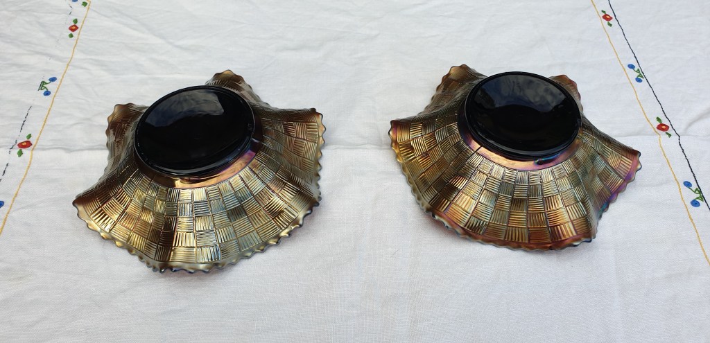 Carnival glass Amethyst bowls – pair, Grape and Cable pattern, collar base with basket weave exterior