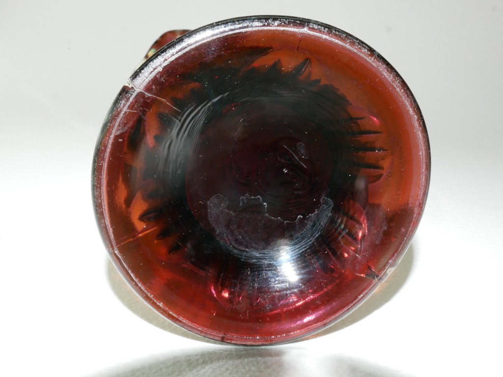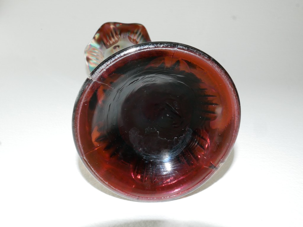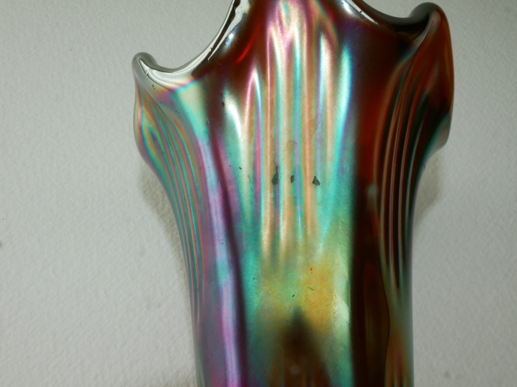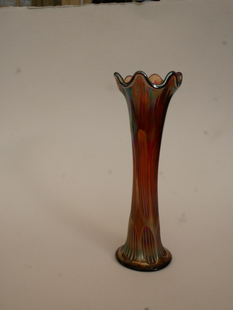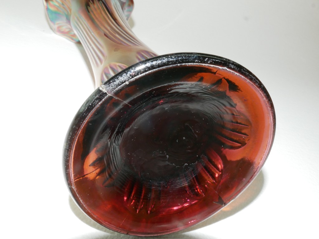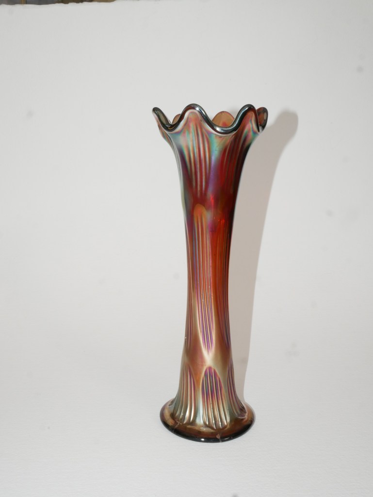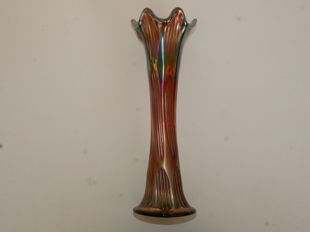 Maker: Fenton, UK C. 1910. Vintage Fenton Carnival Glass Tall Fluted Vase in the pattern known as a diamond and ribs. Features an amethyst base color with an iridescent glaze in shades of purple, copper gold, green with a rainbow hue. Beautiful colour & exceptional iridescence collectible vase. Some nicks and chips commensurate with its age. Please look at the images carefully as they form part of the description. Materials: glass Size: saucer 29cm long x 10cm wide Item code: 14-EW-6p-cnvvase