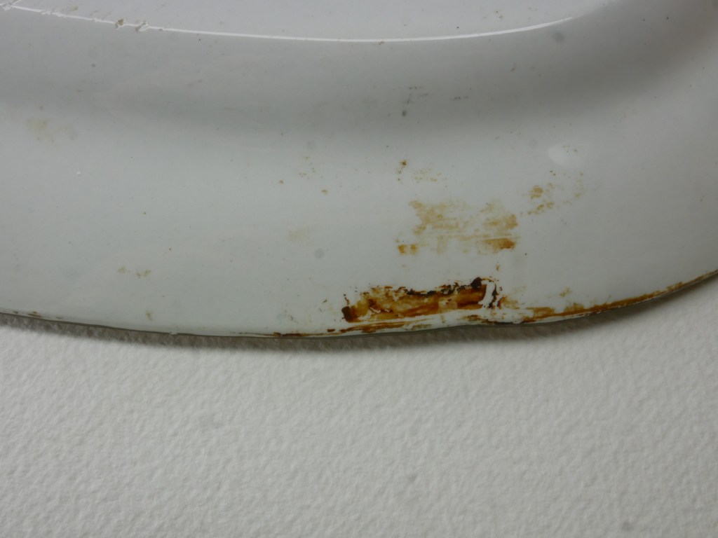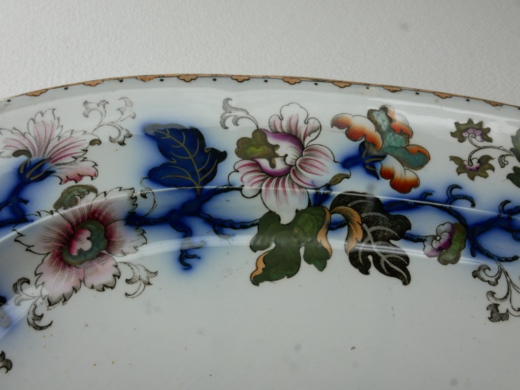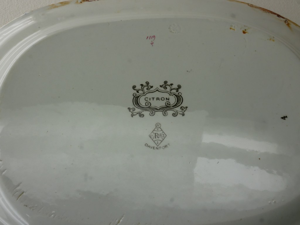 Maker: Davenport, UK C. 1850. Antique serving platter in Citron Mulberry design. The design was registered between 1842 and 1883 and kite stamp indicates 1850 for the make. Very good condition for its age with no cracks or chips. It was likely used as a wall hanging as rust marks are present on the reverse where the metal clasps were in place. This patina has not been removed deliberately. Please look at the images carefully as they form part of the description. Materials: porcelain Size: saucer Oval 33cm x 26cm Item code: 15-MER-12p-Dptplate