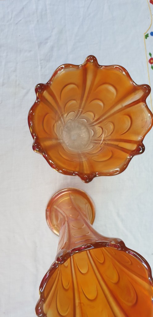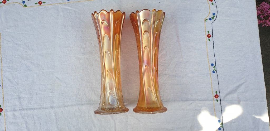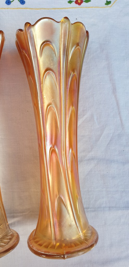 Pair of Diamond Carnival Glass pulled loop Marigold Iridescent Swung/Stretch Vases 10” (22.5 cm)