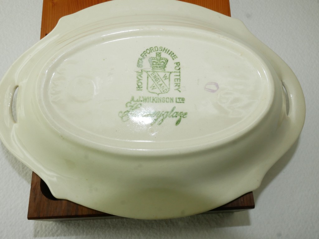 Maker: AJ Wilkinson, Royal Staffordshire 1937+. From a bygone era. Small chip on rim and gilt worn in places. Please look at the images carefully as they form part of the description. Materials: porcelain Size: saucer 16.5 x 11.3 Item code: 18-GUI-250p-sdish