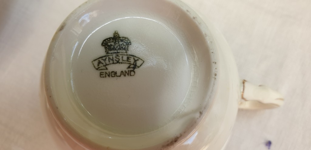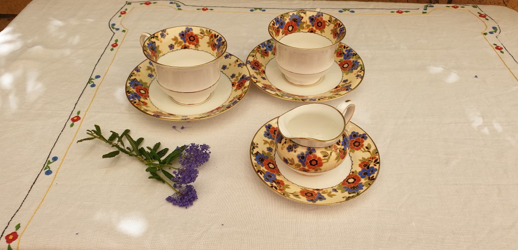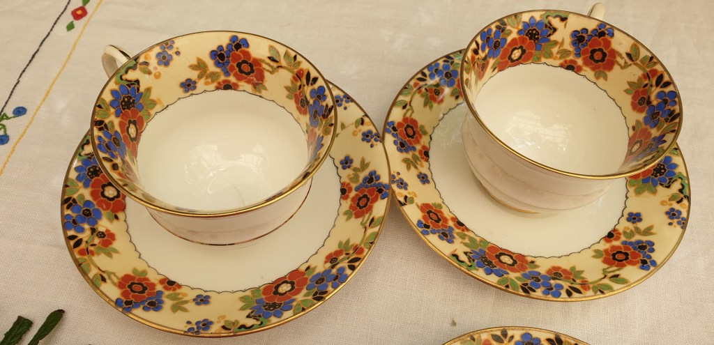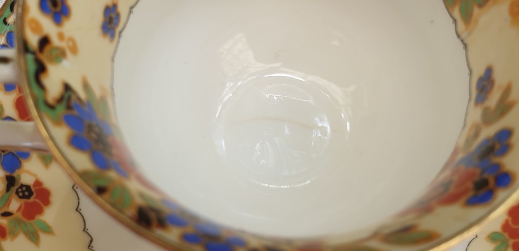 Maker: Ansley, J, UK c. 1925. Anemone pattern, 4500. Decorated with a band of red and blue anemone flowers on a clotted cream band. The set has a gilded edge to all pieces. 1 cup has a small hairline mark in bottom of cup. Please look at the images carefully as they form part of the description. Materials: porcelain Size: cup saucer 14.5cm wide, cup 11cm wide; jug 9.5cm wide x 5cm high, jug saucer 12.5cm wide. Item code: 33-Per-8p-Ansleyduo