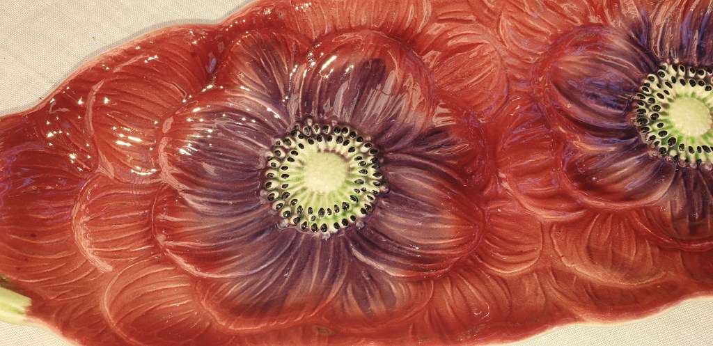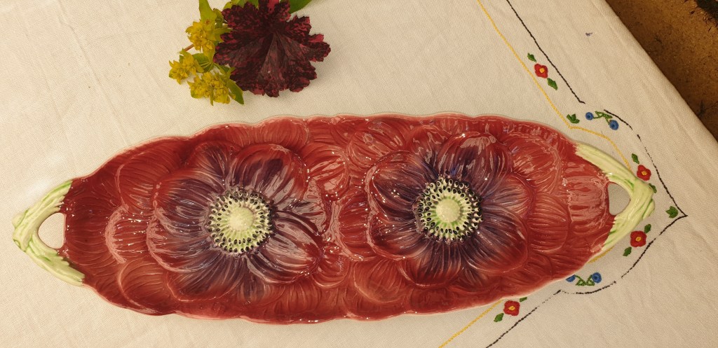Maker: Shorter & Son, Staffordshire, Stoke on Trent c. 1940s. Majolica Anemone serving dish. In great shape no chips or cracks or nicks. Please look at the images carefully as they form part of the description. Materials: ceramic Size: 37cm long x 12.5cm wide x 3cm high Item code: 35-Sco-6p-OblongShorter