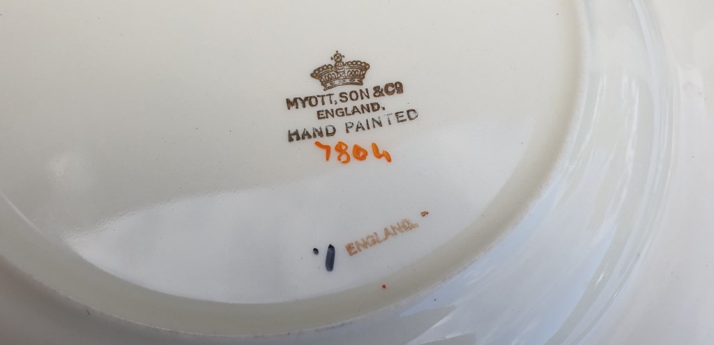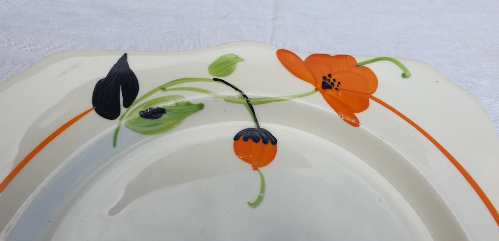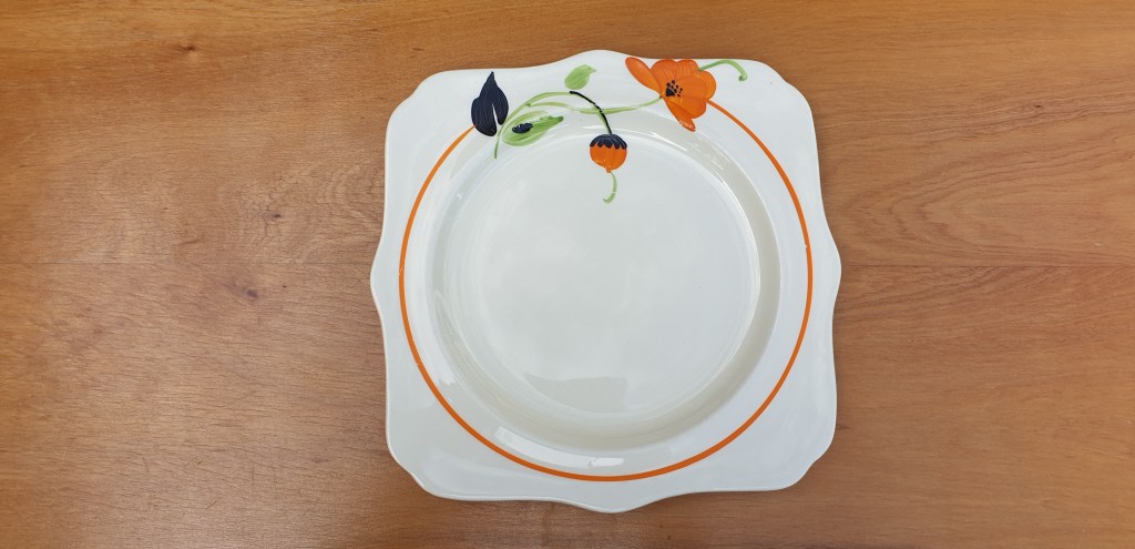 Maker: Myott, UK c. 1930s. This is a striking Myott Tea Plate, pattern number 7804. The pattern is bright and fresh with no fading but some minor wear. No cracks, chips or crazing but a manufacturing rub to glaze on a rear corner. Hardly noticeable. Please look at the images carefully as they form part of the description. Materials: porcelain Size: 25cm on the diagonal Item code: 23-Arm-010-side plate