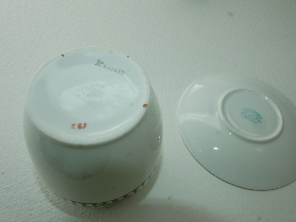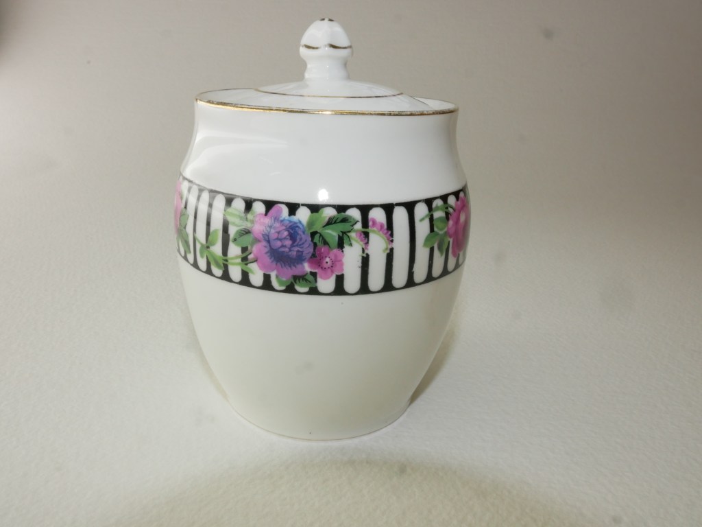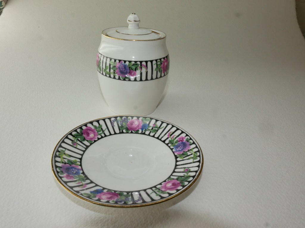 Maker: E. BRAIN & Co. LTD, Manufacturer of porcelain at Foley Works, Fenton. c. 1930s Very pleasing jampot with saucer, gilt trim. Possibly a chocolate pot. Transfer ware. Please look at the images carefully as they form part of the description. Materials: porcelain Size: Pot 12cm high x 10 cm wide, 26.5cm circumference; Saucer 11.5cm Item code: 20-DUM-150p-jampot