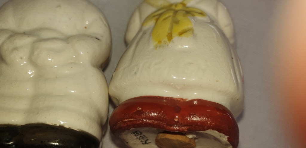 Vintage. Salt and pepper set with FOREIGN impressed into ceramic as well as being stamped on the base near stoppers. The use of the word FOREIGN does not overly help with aging an item* as many countries used the term to export to countries where there may have been a trade embargo etc. We love them for their kitschness and they look old. They are worn in places but still usable. The stoppers look original and are made from cork. Please look at the images carefully as they form part of the description. Materials: ceramic Size: saucer chef 8cm long x 13 cm circumference; cook 8cm long x 13 cm circumference *https://www.porcelainmarksandmore.com/resources/history-notes.php Item code: 33-eb-3p-S&Pforeign