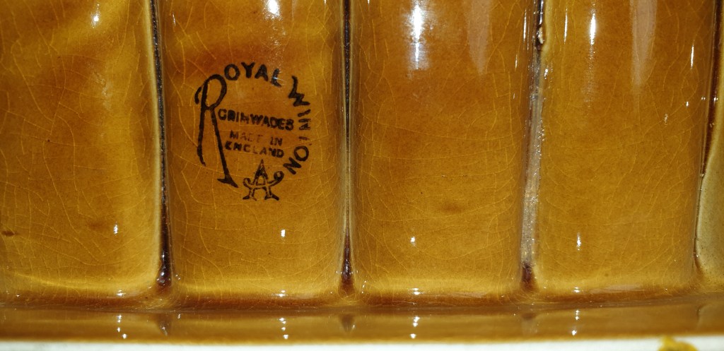 Maker: Grimwades Limited, Stoke-on-Trent, UK 1942+ judging by the back stamp and reference to Joseph (2014)*. For sale is a salt and pepper cellars and matching toast rack. Toast rack has an old repair on the corner. There is crazing on this old beauty. Cellars have original plastic stoppers in excellent condition. Please look at the images carefully as they form part of the description. Materials: ceramic Size: cellar 11 cm high by 15cm circumference; rack 22cm long x 6cm wide and c. 9cm high. *Joseph, F (2014). The Royal Winton Collector’s Handbook from 1925. E-Edition. see https://issuu.com/francisjoseph/docs/royal_winton_all_optimize accessed 9 Nov 2022 Item code: 30-eb-3p-Grimcruet