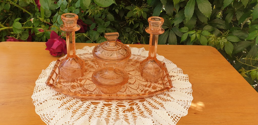 Maker: Walther & Söhne, Germany 1930s, Art Deco. Glass vanity trinket set by Walther and Söhne, a German based glass manufacturer, consisting of a stunning tray, two trinket pots (one small, one large) a pair of candlesticks There are manufacturing lines on the base of the pots and the larger pot has a scratch or manufacturing mark on the base on the inside. Does not detract from the beauty of these uncommon lovelies. Please look at the images carefully as they form part of the description. Materials: Molded glass Size: Tray 30.5cm long x c. 20cm wide; Candlestick holders 11 cm high x 11.5 cm wide at base; Lare pot; c. 11.5 cm wide x 12cm high; small pot 9.5cm wide x 8 cm high. Item code: 38-Thu-25p-Walther