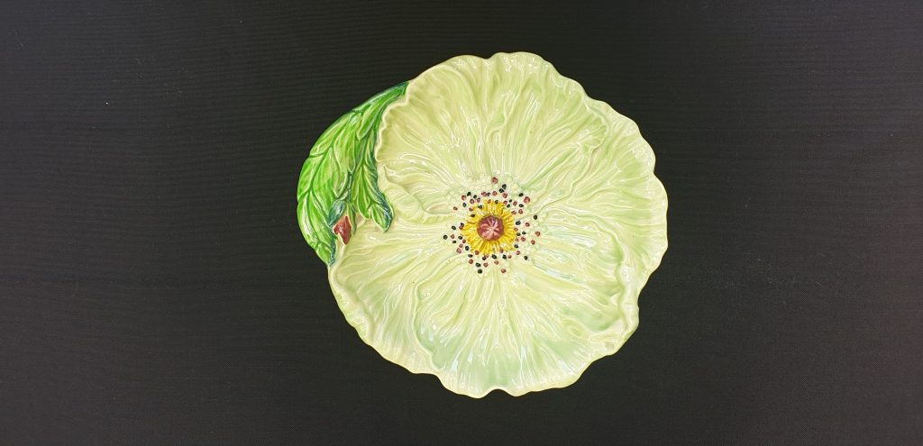 Maker: Carlton Ware, Stoke on Trent, UK c. 1952. A Carlton Ware “Poppy” hand painted green dish. Displaying a desirable aged patina in good original order. Handpainted, quality ceramic with wonderful pattern detail. Impressed mark to base for Carlton Ware, with Registered Australian Design. Please look at the images carefully as they form part of the description. Materials: ceramic Size: 23 cm from handle edge Item code: 42-eb-10p-CWpoppy dish