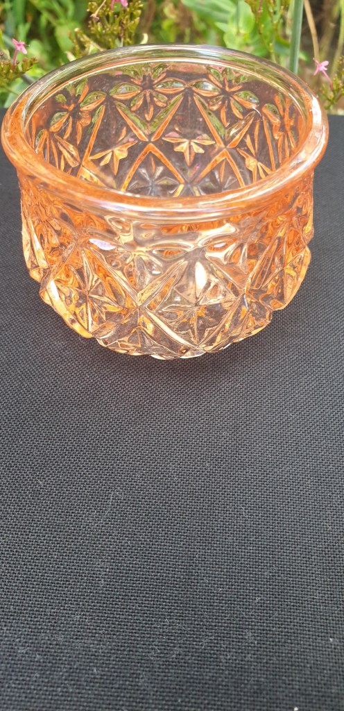 Maker: Unknown c. 1930-1950s. This is a vintage trinket pot that is waiting to be reunited with its lid. There is a small nick on the base rim. It does marry nicely with the antique vanity set, 38-Thu-25p-Walther*. Please look at the images carefully as they form part of the description. Materials: glass Size: 4.3cm wide at top; 24.2 cm circumference at widest point; 5.5. cm high Item code: 41-Sco-5pns-Pink trinket pot