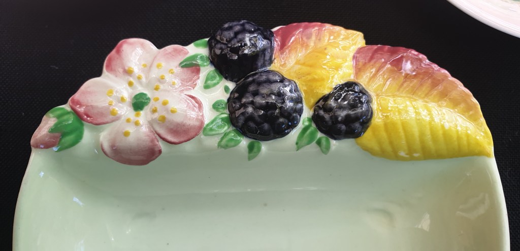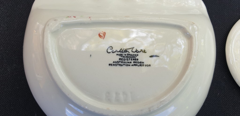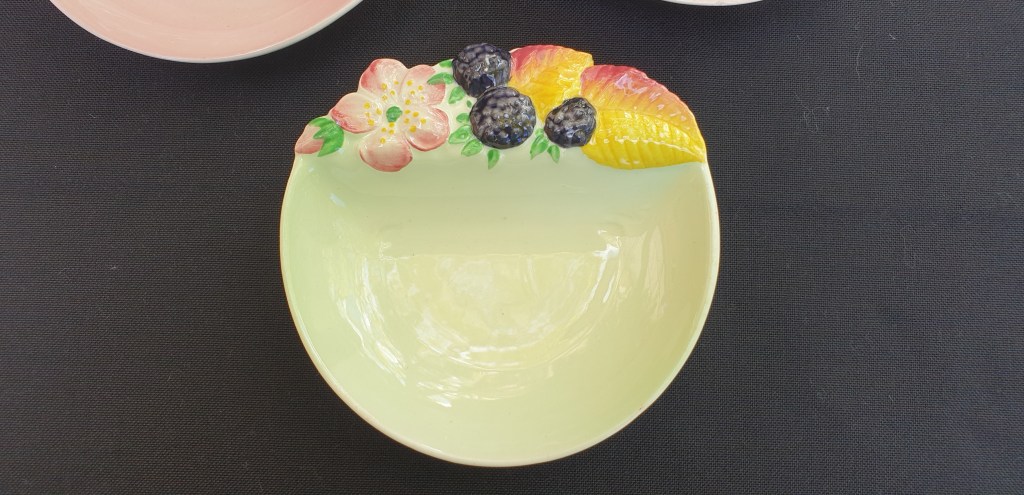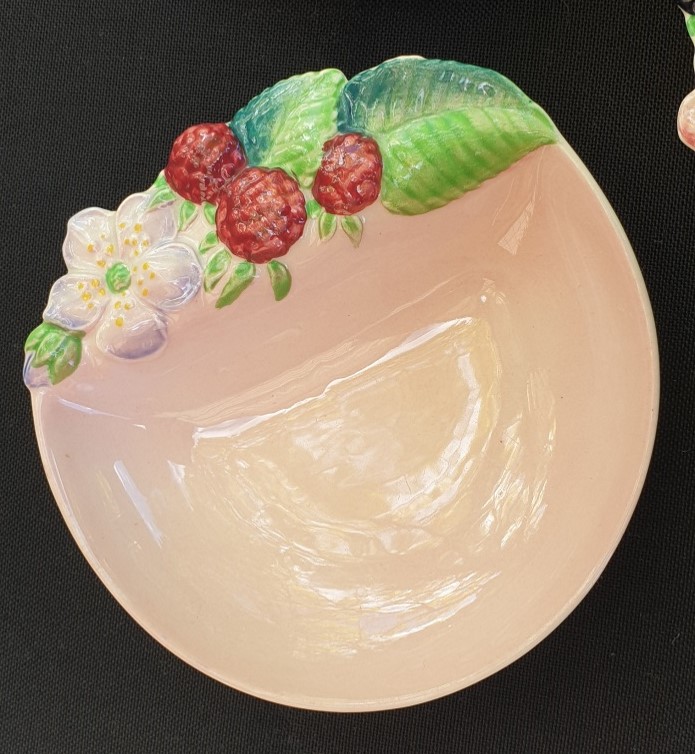 Maker: Carlton Ware, Stoke on Trent, UK Blackberry in green colourway and Strawberry in pink colourway. First produced from c. 1936-37, impression stamp 1473. Excellent condition. No chips or obvious crazing. Impressed mark to base for Carlton Ware, with Registered applied for Australian Design. Please look at the images carefully as they form part of the description. Materials: ceramic Size: 11.5 cm x 11.3cm Item code: 45-var-1035p-cwautberriesjam