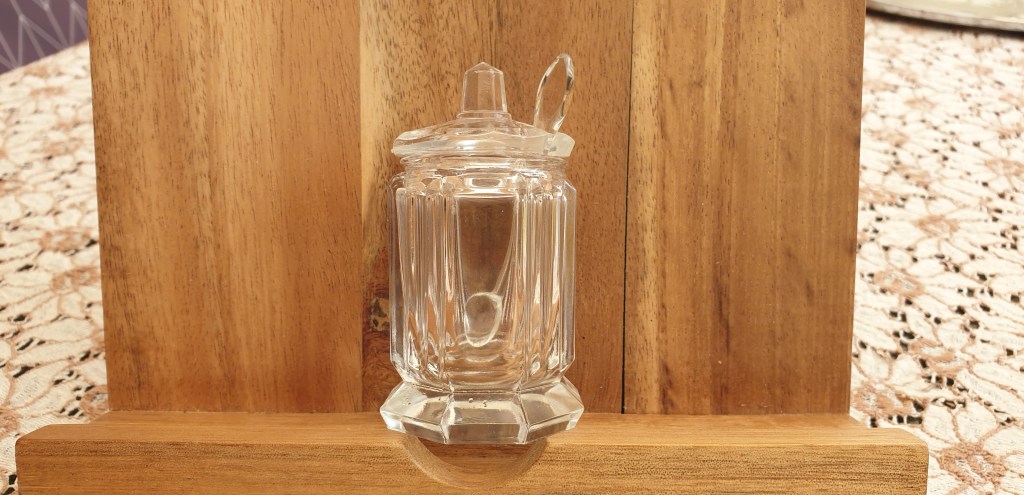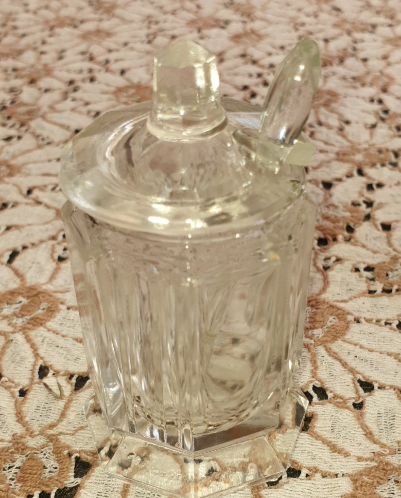 Maker: unknown, Czechoslovakia This would have formed a trio with a salt and pepper cruet. In excellent condition and the spoon has made it through! On the underside it is engraved with Made in Czechoslovakia. Please look at the images carefully as they form part of the description. Materials: Glass Size: Pot 7.8cm high x 2.5 cm internal diameter at rim, spoon 7cm long Item code: 58-sk-5p-czechmpot