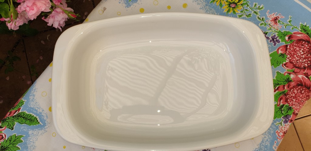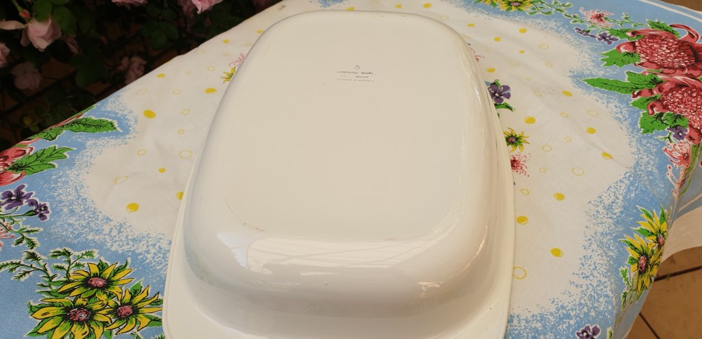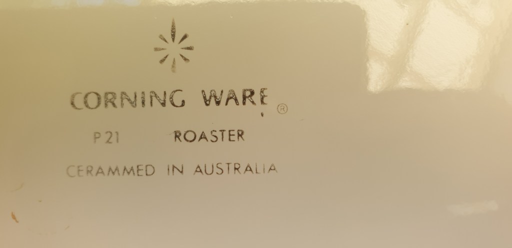 Maker: Corning Ware, Cerammed in Australia c. 1970s. Corning Ware Bakeware Roaster 13 inch Open Roaster pan, P21, that looks so great that it will need to go from oven to table to delight your guests. It is in great condition with a few very minor scuff marks on underside. This model was not made with a lid*. Please look at the images carefully as they form part of the description. Materials: glass ceramic, thermally treated (cerammed). Read this blog from a Corning Ware devotee on the very interesting product development history** Size: outside dimensions c. 39.5cm L x 25.5cm wide x c. 6cm high. Item code: 53-arm-2-CwCornRoast * https://www.corningware411.com/p/list-of-known-blue-cornflower-pieces.html **https://www.corningware411.com/2011/09/greetings-and-salutations.html