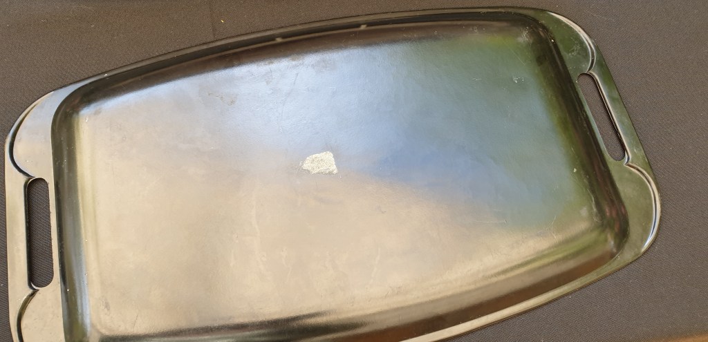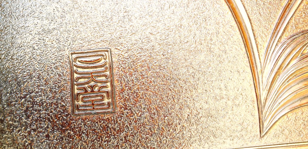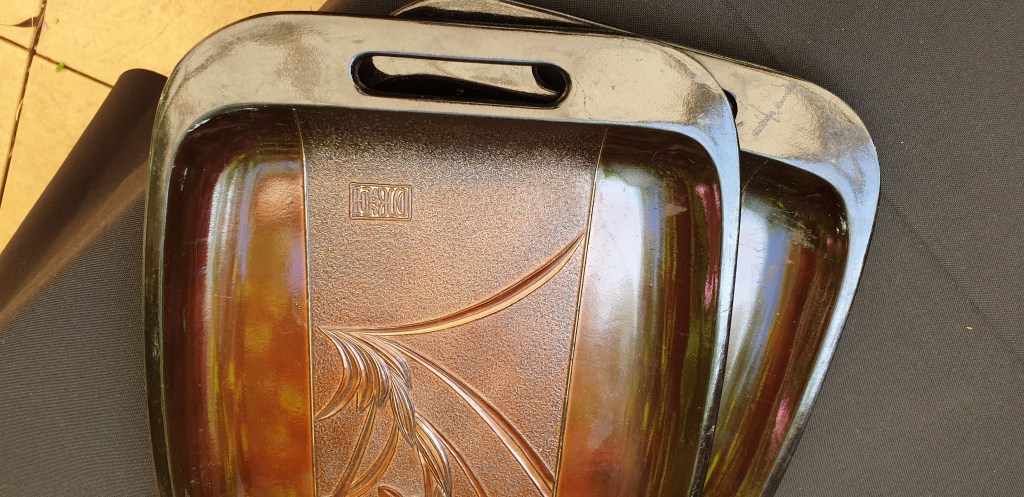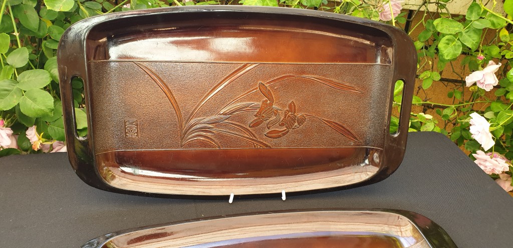 Maker: unknown, possibly Wu Tiantang House of Heaven Retro. Just the things for that vintage look as these trays are both ornamental and functional. Long melamine trays with embossed stylized iris flowers and with embossed characters that might translate to Wu Tian Tang House of Heaven. There are some scuff marks, no deep scratches. Make a great impact at your next cocktail party with these trays in service. Please look at the images carefully as they form part of the description. Materials: Melamine Size: 45cm long from handle outer edge to handle outer edge x 26cm wide, 1.5cm high Item code: 59-bron-4-meltraysbron