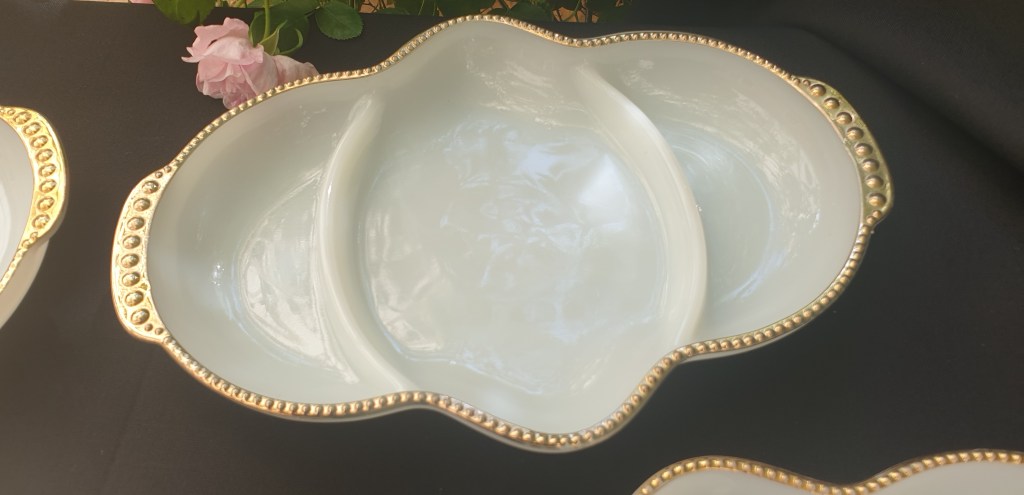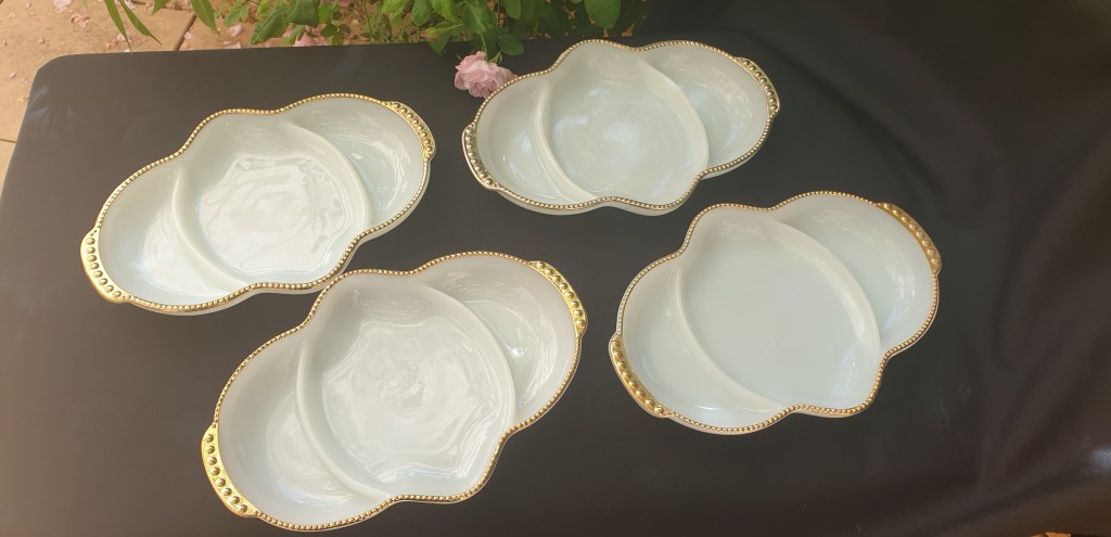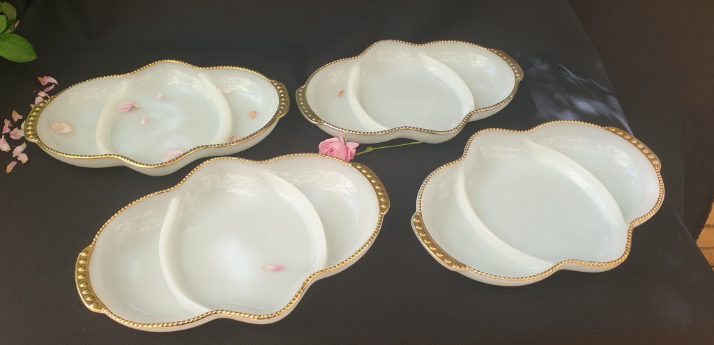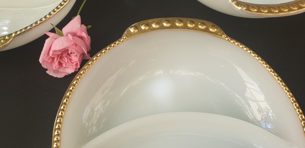 White Milk Glass, Gilt Trimmed Serving Bowls in Fire King Range – 4 in the Set