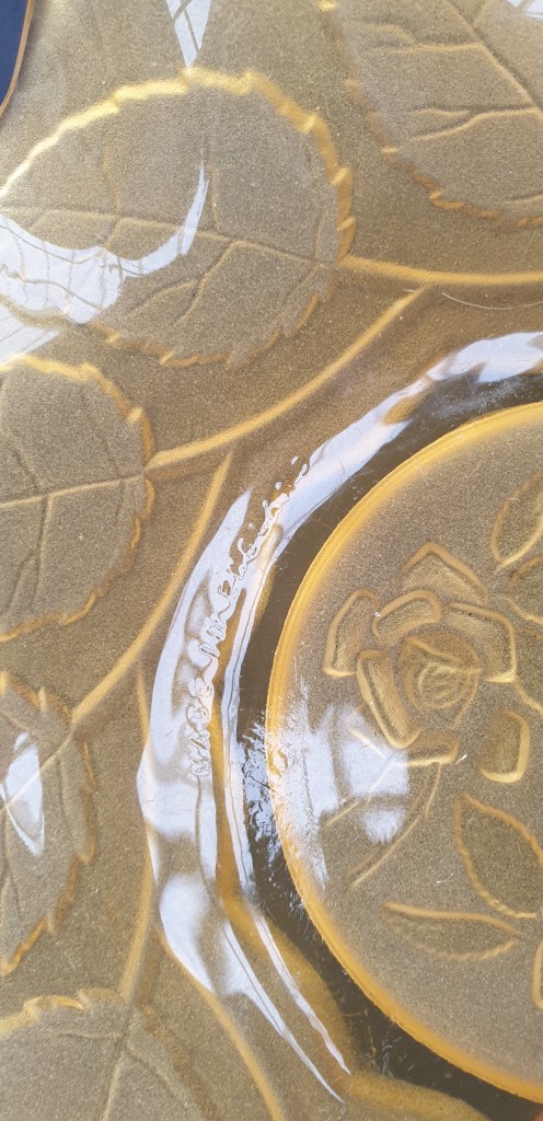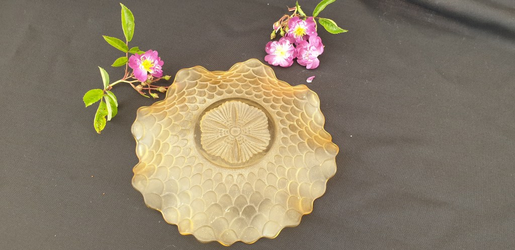Maker: Bagley, UK c. 1945-1975 Frosted [acid etched] cake plate in ‘Rose Leaf’ pattern in amber (possibly pattern 3187). 1938-1959 Frosted [acid etched] cake plate in ‘Fish Scale’ pattern in amber (pattern number 3067). In very good condition with some minor scratches on the bases. Both with Made In England although marks are hard to discern. Sold as a pair. Please look at the images carefully as they form part of the description. Materials: Glass Size: both 22 cm diameter Item code: 72-arm-12-bagleyamb