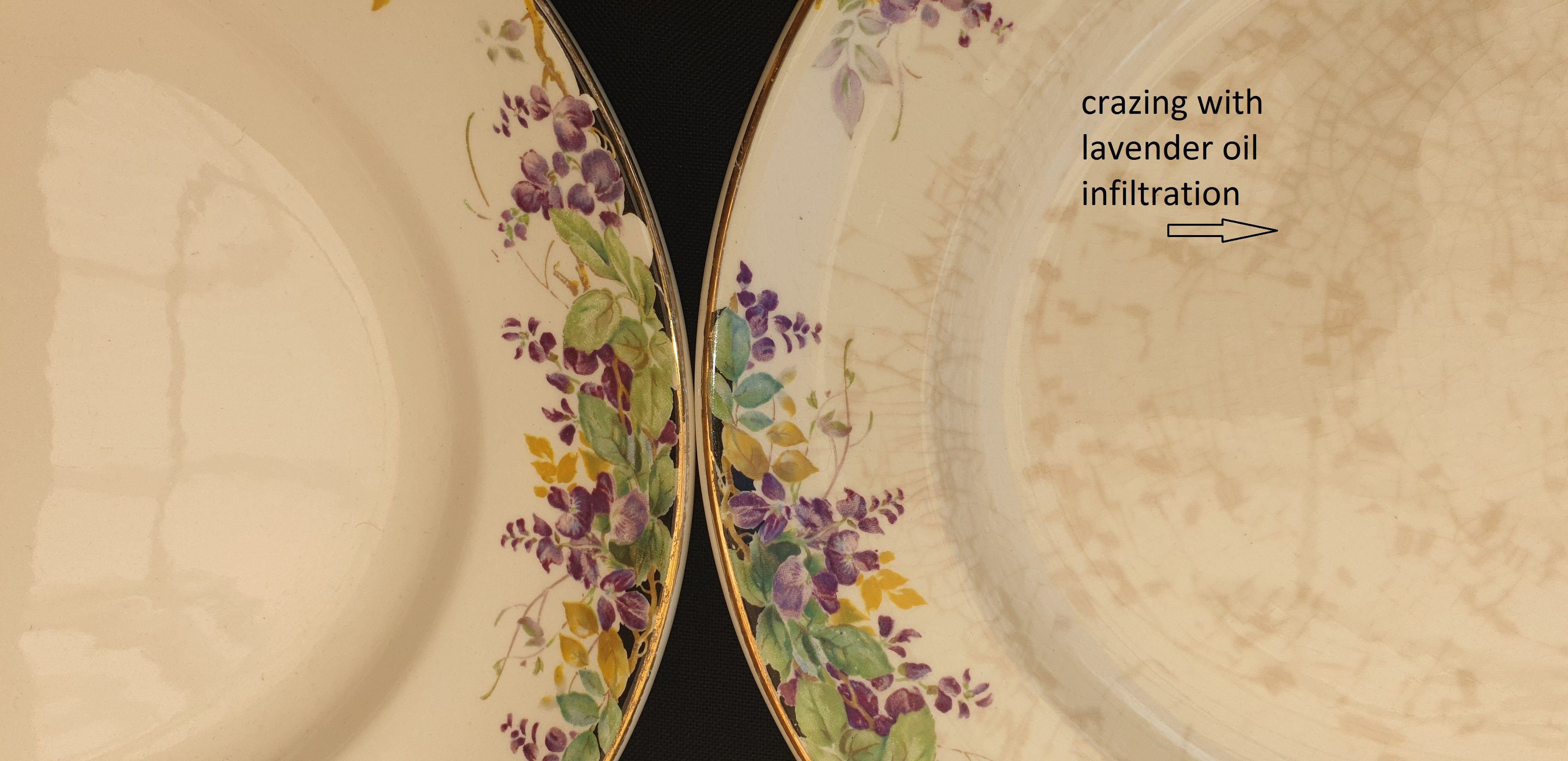 Another thing to check carefully is the location where you display your ceramics. We have a 1940s Royal Doulton Wistaria dinner set (see above), a much treasured heirloom that came with some crazing when we inherited it. However, a serving plate was placed near a vase of lavender and the deposition of small florets of lavender on to the plate transferred lavender oil into the crazing making it more obvious. A lesson learnt there.