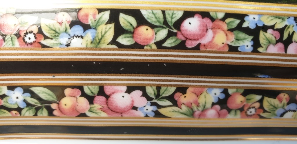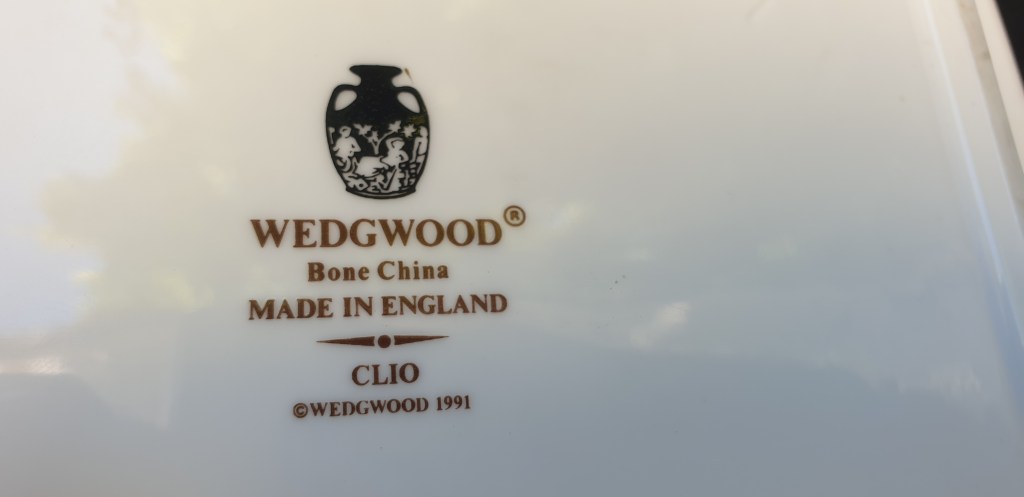 Maker: Wedgewood, England, UK This lovely gilt edge tray with black bands and a floral motif is from Wedgwood’s out of production Clio range. This plate is from 1991. Good condition without cracks or chips. Small specks on the black band as pictured, hardly noticeable. Will make a great purchase as a stand-alone feature plate or to add to the highly collectible Clio service. Please look at the images carefully as they form part of the description. Materials: Bone China Size: 20cm log x c. 16.5cm wide Item code: 80-law-11/5-wedge