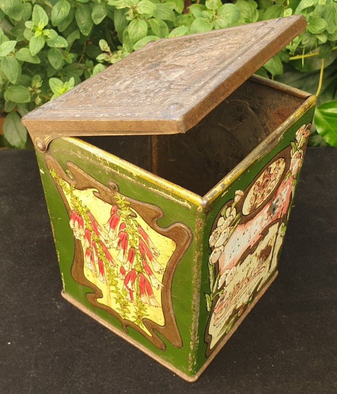 It often starts off with just one tin and no intention of gathering more for a collection. Then along comes a bargain, an opportunity, an Irresistible addition to your lonely tin on the kitchen shelf. Then away you go – looking for retro and vintage style of different colours, eras, shapes and country of origin. Hariet senior’s very generous brother drove across Perth to pick up a Federation tea tin for her birthday one year – pictured here. This series were produced from 1900-1940 by Griffith’s Tea. The one shown here looks to be in the 1900s era with its Art Nouveau decorations. They sold them with tea but with kitchen food labels so that the customer would collect a set (and buy more tea)– and then they would be useful in the kitchen. The tin shown here is for Barley and we have seen tins for Tapioca, Rice, Sago, Currants, Oatmeal and Starch. The pictures of Australian native flowers is set against a dark green background.On each other side of the tin is a different native Australian flower. The lid is impressed with a flannel flower. They are often in poor condition unfortunately and probably best not to store tea in them now. There is a terrific display here in the Museum of Applied Arts & Sciences [https://collection.maas.museum/search?q=tea%20tin] of Griffith’s Tea tins and other brands such as the iconic Bushells. Twinings Tea tins are another highly sought after range of tea tins – we think there are hundreds to be collected. On our recent collecting trip in the UK we were surprised to not see Twinings tins for sale in the usual foraging places (flea markets etc). Fortnum and Mason tins on the other hand were abundant. Mr Stanislav Breja from Bratislava, Slovakia [Who you can find more about here] has a fascinating collection of more than 2500 tins – including many Twinings tins.
